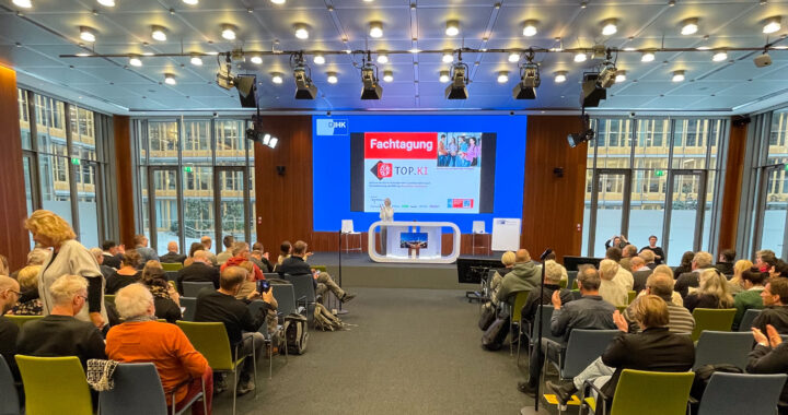 Über 100 Akteure aus Prüfungswesen und beruflicher Bildung fanden sich bei der DIHK ein, um die Ergebnisse unseres Projekts TOP.KI kennenzulernen und selbst auszuprobieren. Wir konnten uns über die ermunternden Grußworte von Dr. Oliver Heikaus, Bereichsleiter Weiterbildung DIHK und Anja Liv Niephaus, Bundesministerium für Arbeit und Soziales freuen.